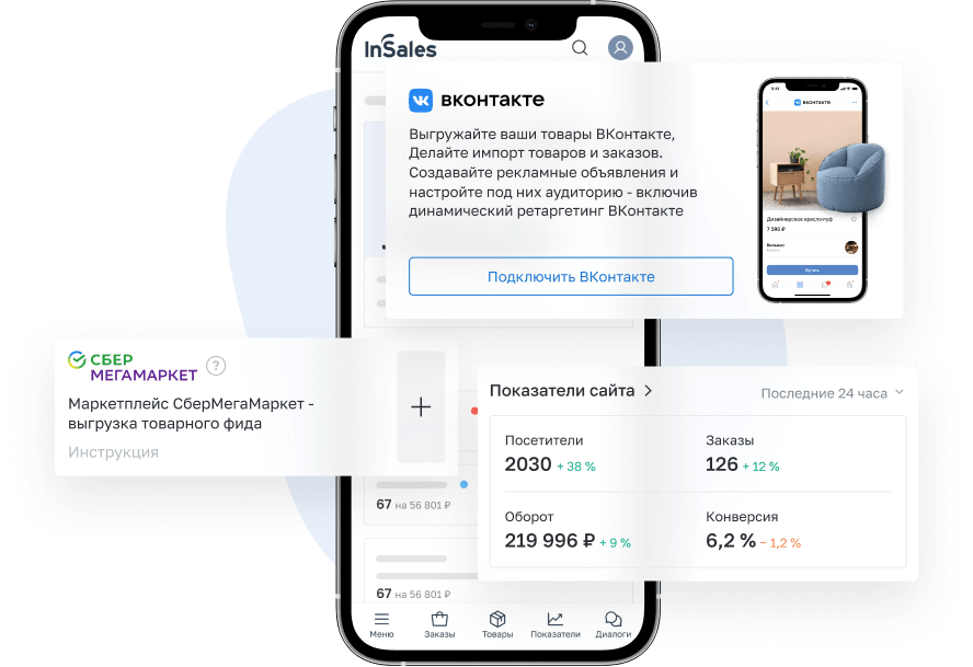 В InSales уже есть интеграции с OZON, Wildberries, AliExpress, Avito, СберМегаМаркет, Яндекс.Маркет, а также Товары ВКонтакте и Товары ОК. Всеми продажами можно управлять из одного окна, смотреть аналитику и автоматизировать работу с площадками.